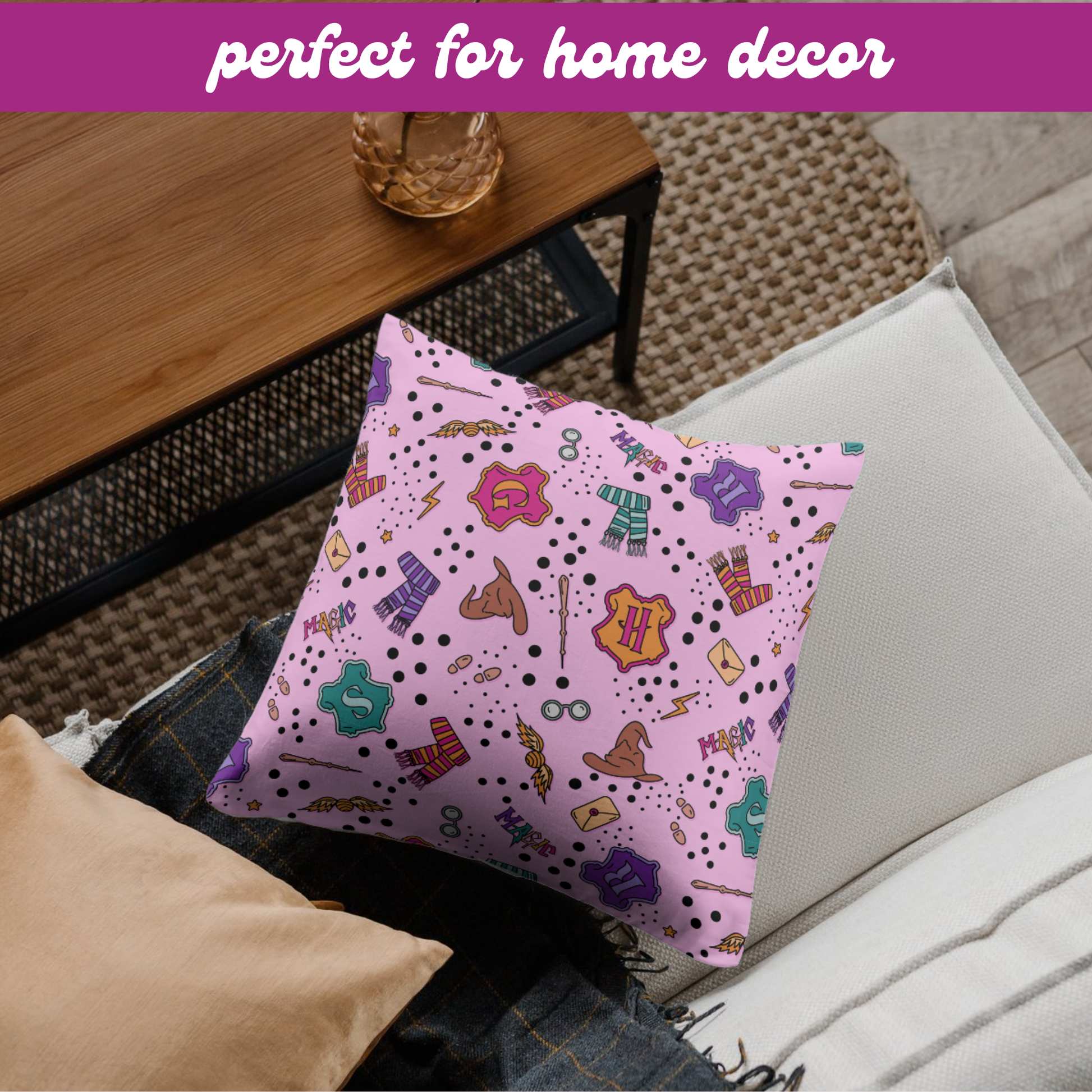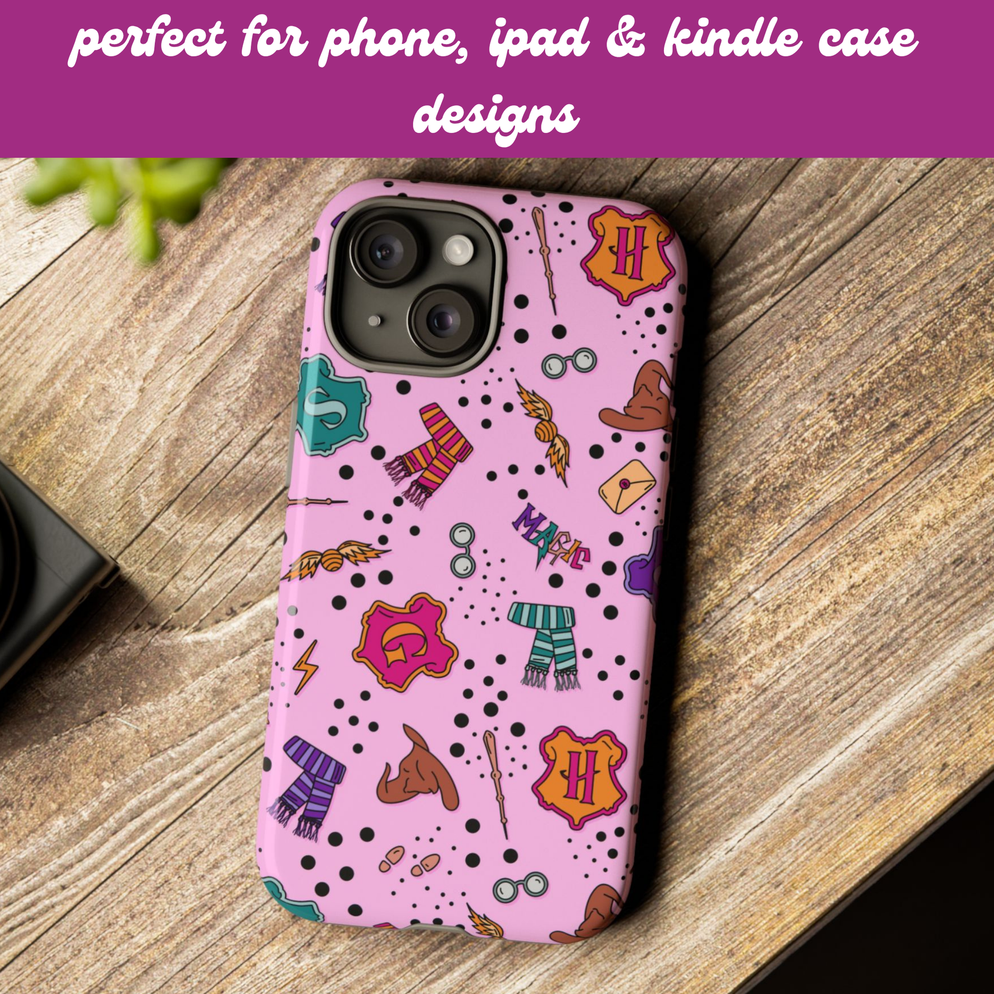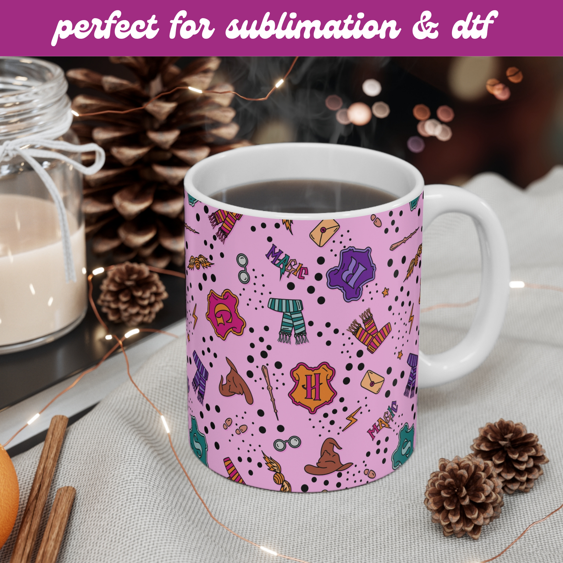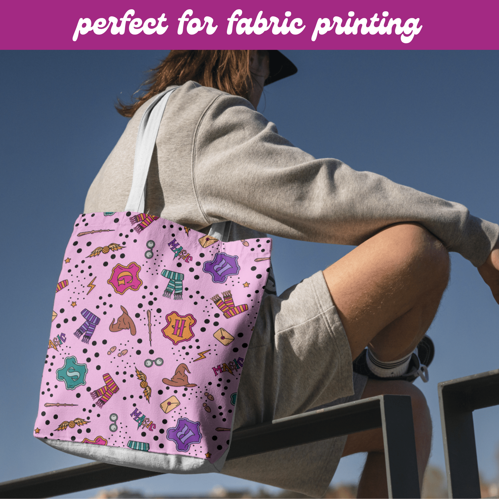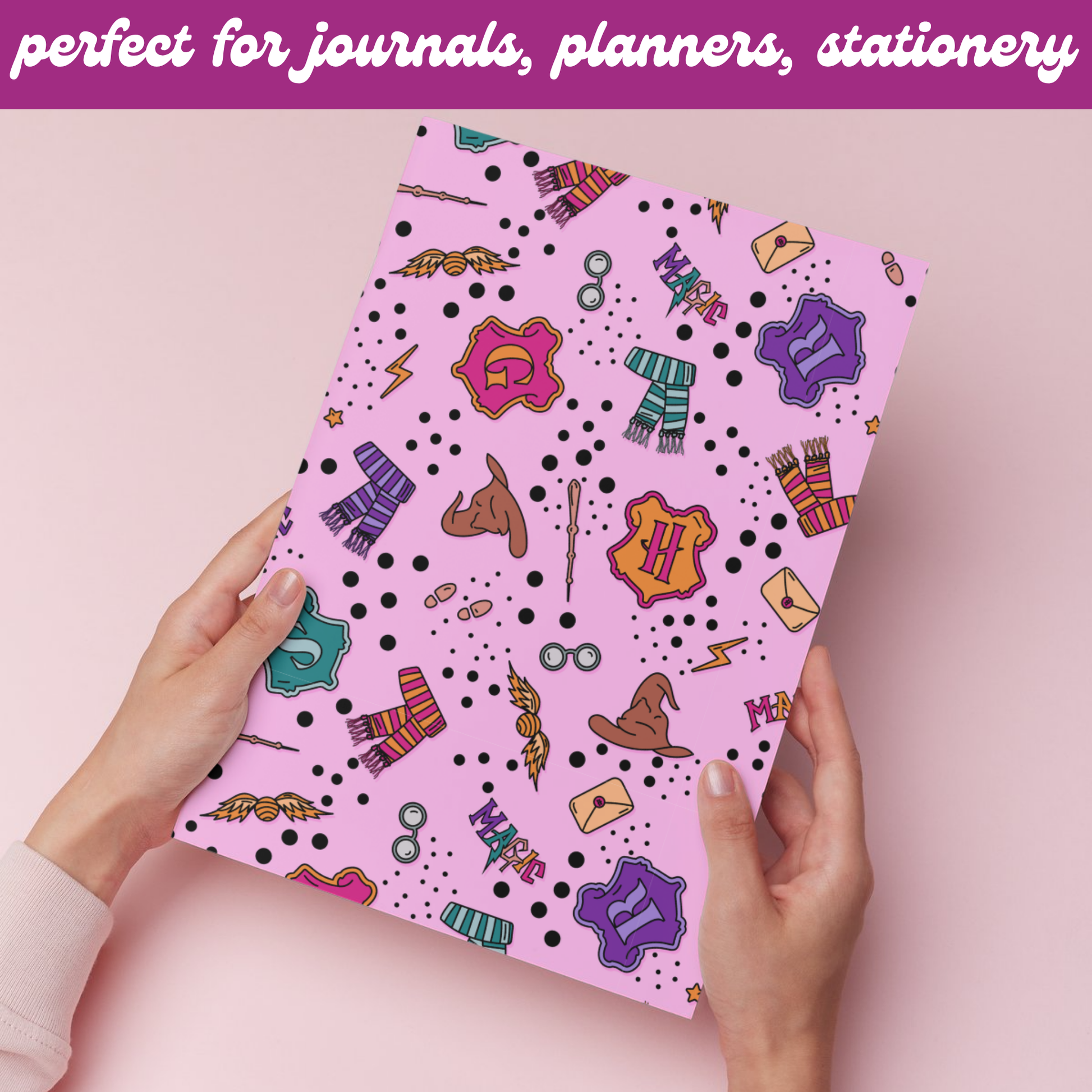 Bring a touch of magic to your creations with this pink seamless pattern inspired by the wizarding world — featuring house symbols, snitches, and wands. Perfect for countless creative uses like wallpapers, journals, fabric printing, tote bags, mugs, stickers, and more. A whimsical design made for every bookish witch or wizard at heart.